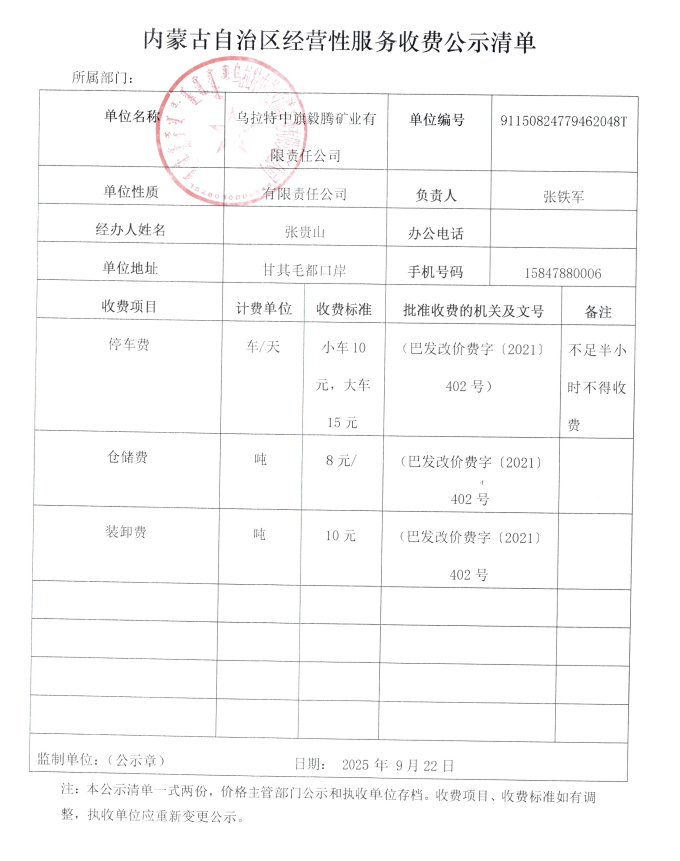 乌拉特中旗毅腾矿业有限责任公司经营性服务收费公示清单