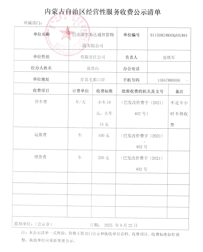 巴彦淖尔易达通智慧物流有限公司经营性服务收费公示清单