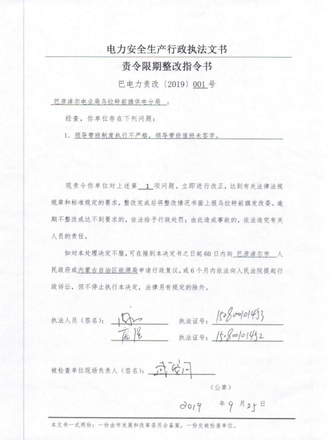 乌前旗供电分局限期整改指令书